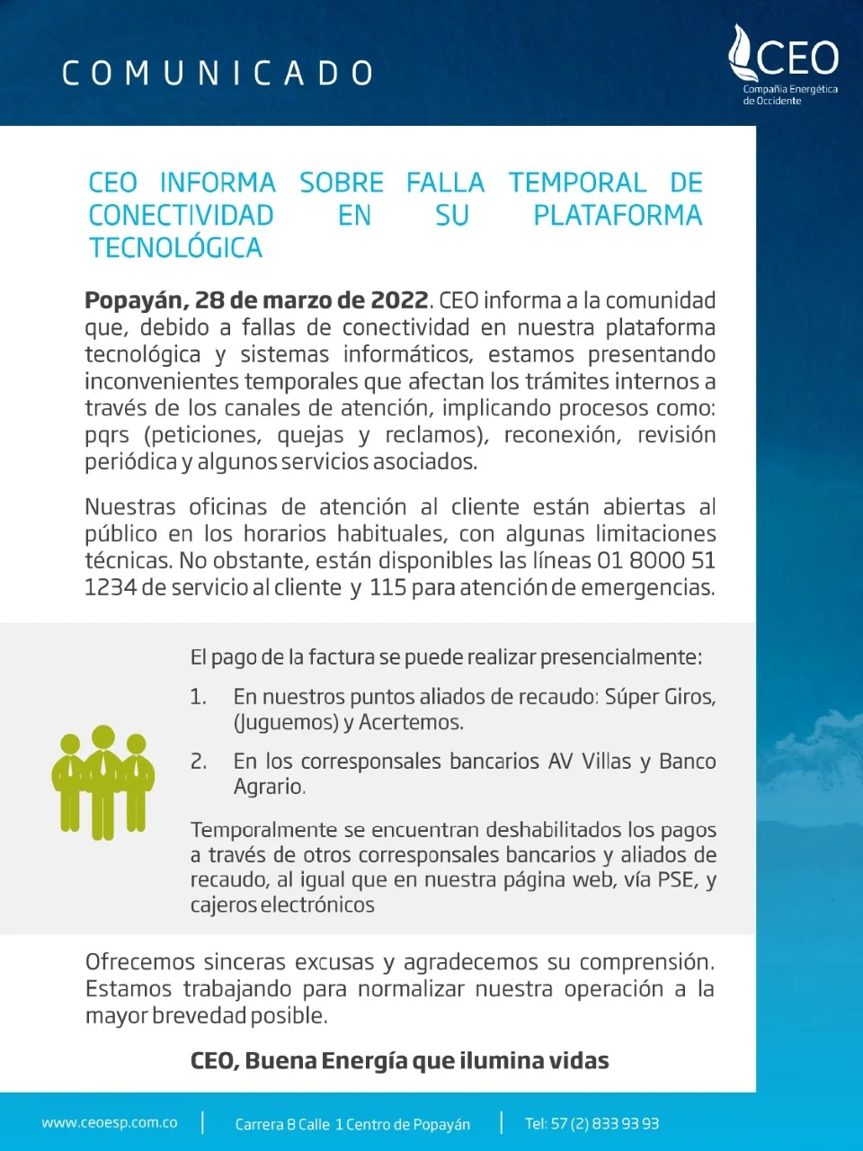 CEO informa a la comunidad que, debido a fallas de conectividad en nuestra plataforma tecnológica y sistemas informáticos, estamos presentando inconvenientes temporales que afectan los trámites internos a través de los canales de atención, implicando procesos como: pqrs (peticiones, quejas y reclamos), reconexión, revisión periódica y algunos servicios asociados.