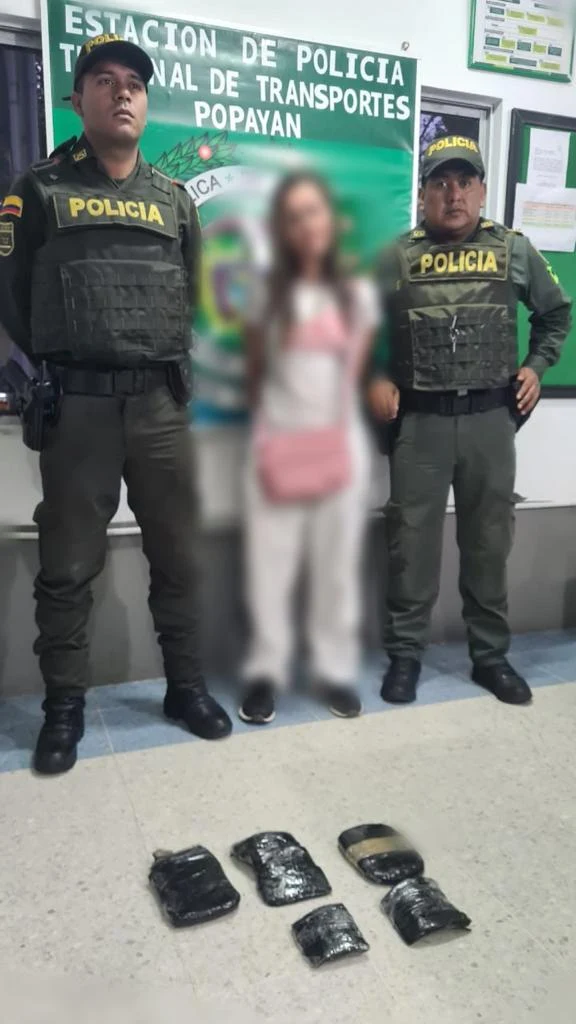 El procedimiento policial tuvo lugar en el terminal de transportes de Popayán, cuando los uniformados adelantaban operativos de registro a un autobús de servicio público que cubría la ruta Pitalito (Huila) – Santander de Quilichao (Cauca). Al interior del automotor, una mujer quien al notar la presencia policial se torna nerviosa, fue requerida para un registro, en su poder, le fueron halladas cinco bolsas negras con 2 kilos de base de coca en su interior.