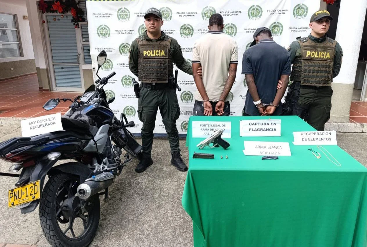 El señor Coronel Giovanni Enrique Torres Bautista Comandante del departamento de policía Cauca se permite informar que, integrantes del Nuevo servicio de policía orientado a las personas y los territorios, logran la captura de 02 sujetos en Santander de Quilichao quienes se transportaban en una motocicleta, quienes momentos antes habían hurtado las pertenencias a un ciudadano; quien mediante voces de auxilio, logra direccionar a la patrulla de vigilancia, la cual por mediante su rápida reacción logran interceptar a los dos ciudadanos unas cuadras más adelante, a quienes al realizar el respectivo registro a persona, se logra evidenciar que dichos sujetos portaban 01 arma cortopunzante tipo navaja, 01 arma de fuego tipo traumática y las pertenencias del ciudadano.